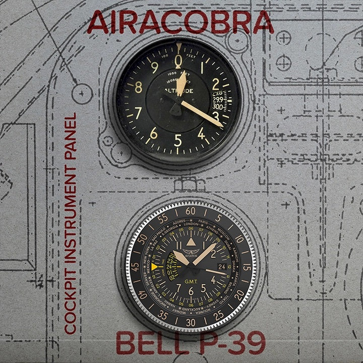 Hodinky AVIATOR AIRACOBRA GMT, inspirované touto inovací, spojují styl a ergonomii, odrážejí tvar letadla a křídla v jeho výstupcích a zároveň vzdávají hold letadlu Airacobra. Ciferník, inspirovaný přístrojovým vybavením letadla, upřednostňuje viditelnost a čitelnost různých indikací.