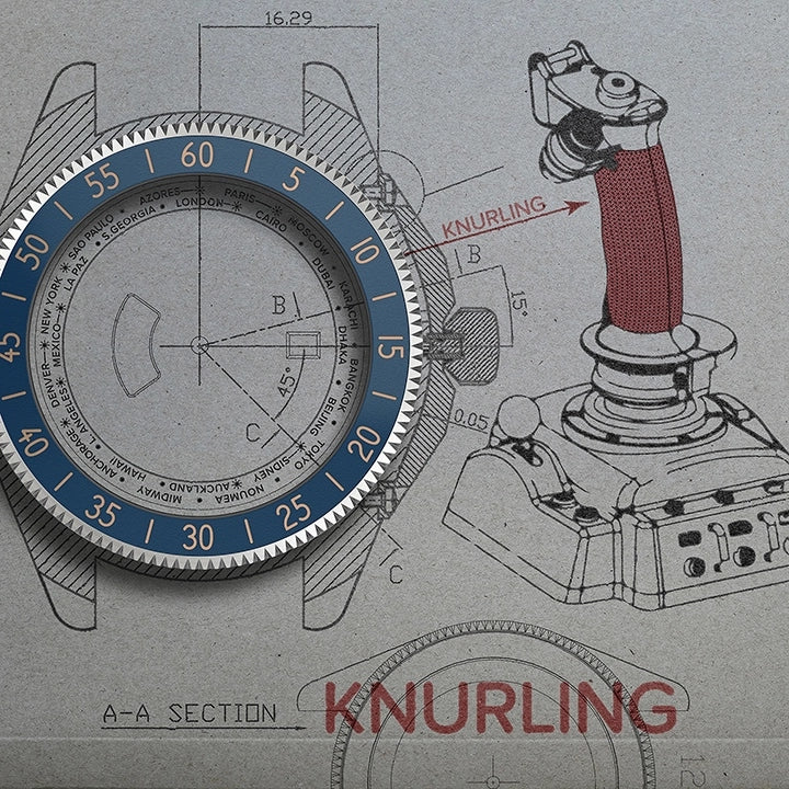 Složitý vroubkovaný vzor na lunetě hodinek, vyrobený s precizností, čerpá inspiraci ze základních prvků ovladače, které se nacházejí v kokpitu letadla. Tento design nejen vylepšuje sofistikovaný vzhled hodinek, ale také zajišťuje bezvadné uchopení pro snadné otáčení lunety.