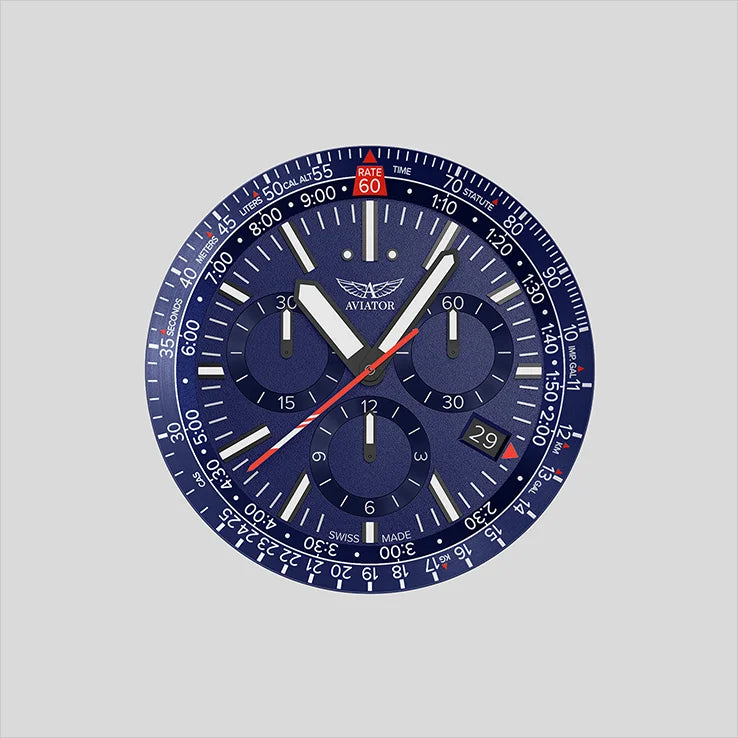 Inspirovaný přístrojovým panelem MiG-29, s vícefunkčností a různými úpravami, ciferník vám umožňuje sledovat tři úrovně informací: letecké posuvné pravítko na rotujícím reflektoru, čas a stopky se třemi chronografovými očima a centrální stop vteřinovku. Jeho čisté indexy a výrazné ručičky nabízí snadnou čitelnost, zatímco linie posuvného pravítka a kruhy chronografu dodávají vysokotechnologický pocit. Jelikož každý ciferník AVIATOR je výsledkem velmi přesného inženýrství a výrobních dovedností, dostanete kvalitu na nejvyšší úrovni, jaká nemá obdoby.