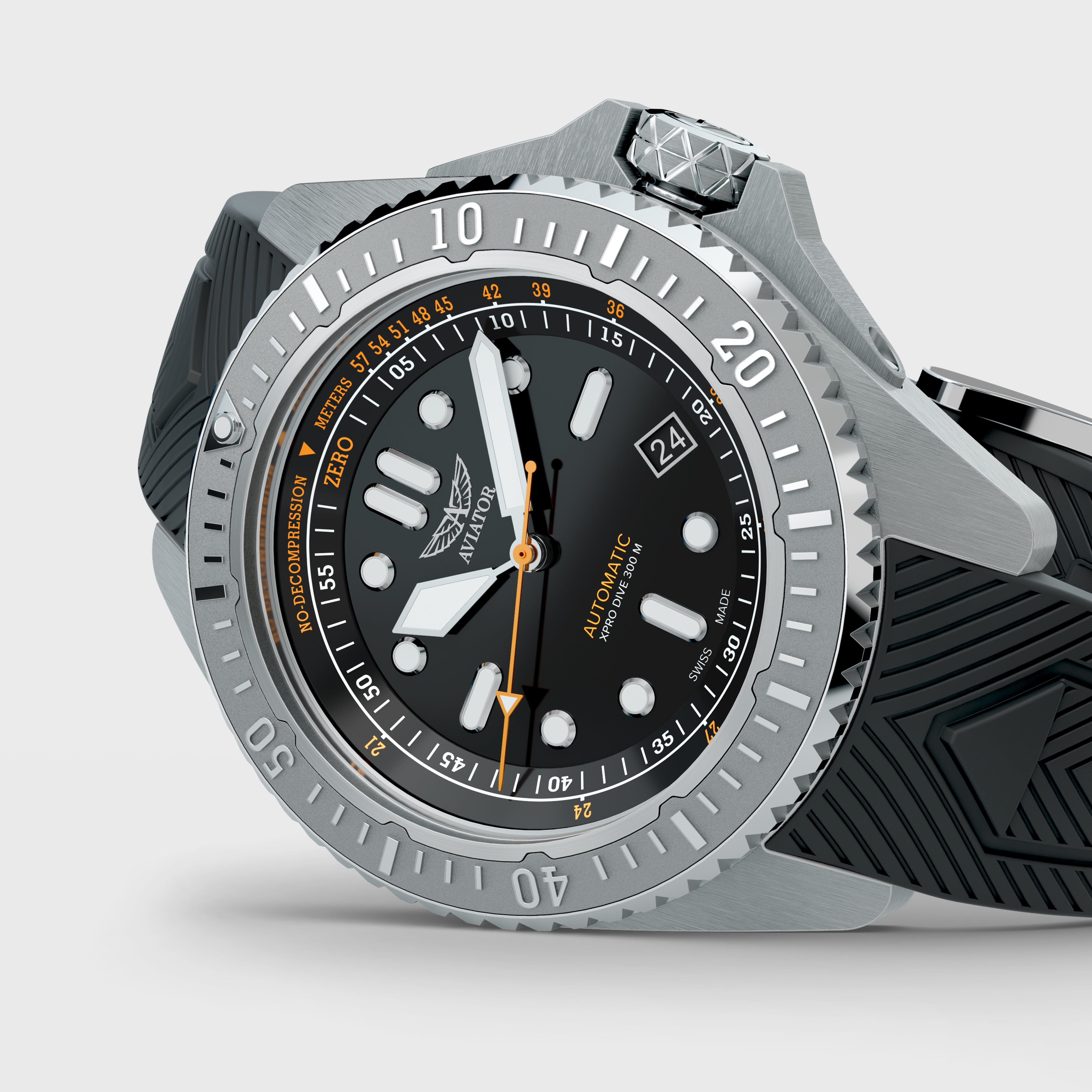 The AVIATOR XPRO 300 AUTO is a tool watch designed for two worlds – water and air. At the heart of the watch is a precise automatic Swiss movement that guarantees reliability in any environment. Two decompression scales, inspired by the Navy SEALs Diving Manual , help you maintain safe dive time limits – whether you’re diving at sea level or in high-altitude lakes.