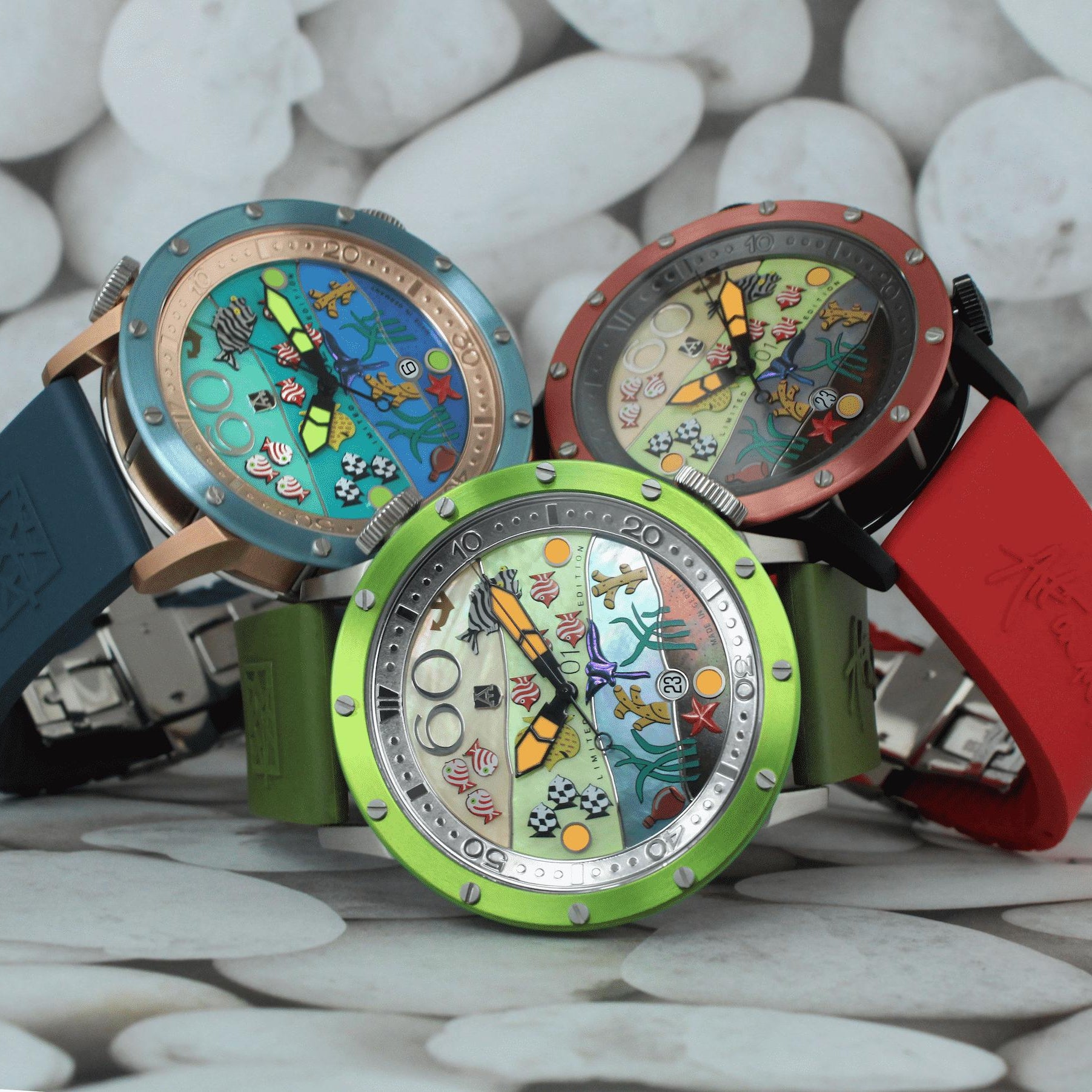 Ciferník zaujme prechodom štyroch odtieňov perlete – od svetlej po tmavú, ktoré imitujú hĺbku vody. Farebné ryby, morské prvky a symbolické detaily ako fľaša s odkazom (na 8. hodine) či stará kotva (na 1. hodine) sú prevedené v 3D štýle, ktorý vyniká plastickosťou a hravosťou. Každá ryba má priateľský výraz – odkaz na dobrú náladu dizajnéra počas tvorby.