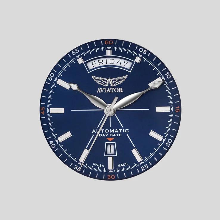 Hodinky AVIATOR Douglas Day Date disponujú intenzívnym slnečným povrchovým spracovaním, elegantne zakriveným indikátorom dňa a oknom s lichobežníkovým tvarom pre kalendár. Keďže viditeľnosť a čitateľnosť sú kľúčové vlastnosti, kolekcia Douglas Day Date spája dizajn Art Deco s funkciou – od leštených kovových indexov po dekoratívne, jemné akcenty na ručičkách inšpirované kokpitom, tieto hodinky sú nezvratne nadčasové vo svojej sofistikovanosti.