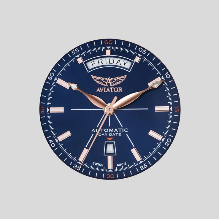 Hodinky AVIATOR Douglas Day Date disponujú intenzívnym slnečným povrchovým spracovaním, elegantne zakriveným indikátorom dňa a oknom s lichobežníkovým tvarom pre kalendár. Keďže viditeľnosť a čitateľnosť sú kľúčové vlastnosti, kolekcia Douglas Day Date spája dizajn Art Deco s funkciou – od leštených kovových indexov po dekoratívne, jemné akcenty na ručičkách inšpirované kokpitom, tieto hodinky sú nezvratne nadčasové vo svojej sofistikovanosti.